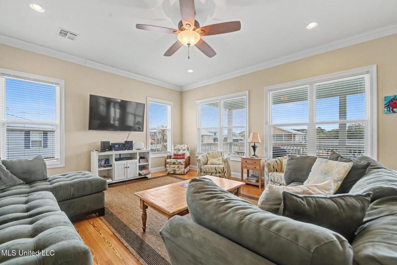 Welcome to refined coastal living in this custom-built waterfront retreat by Garcia and Sons (2010), perfectly positioned along a peaceful canal with 84 feet of waterfront just moments from the Jourdan River.Designed for effortless entertaining and everyday comfort, this 4-bedroom, 2.5-bath home offers approximately 1,900 square feet of thoughtfully curated living space. The open-concept floor plan flows beautifully, with the kitchen seamlessly overlooking the dining and living areas, creating a light-filled central gathering space that feels both spacious and inviting.The kitchen is appointed with stainless steel appliances and a generously sized island with seating, making it ideal for hosting sunset dinners or casual mornings before heading out on the water. Crown molding throughout adds architectural elegance and a polished finish to every room.The primary suite provides a private retreat with an en suite bath featuring a double vanity and ample space to unwind. Three additional bedrooms offer flexibility for guests or a dedicated office space.Step outside to a large covered porch where stunning canal views set the backdrop for coastal breezes and golden-hour evenings. With close proximity to the Jourdan River, boating adventures are always within easy reach.Below the home, you'll find expansive covered space complete with storage, TV hookups, and ample room for entertaining. Whether hosting game days, seafood boils, or relaxed waterfront gatherings, this lower level extends your living space outdoors. A durable metal roof adds both style and long-term peace of mind.This is more than a home. It is a waterfront lifestyle designed for those who appreciate craftsmanship, comfort, and connection to the water.