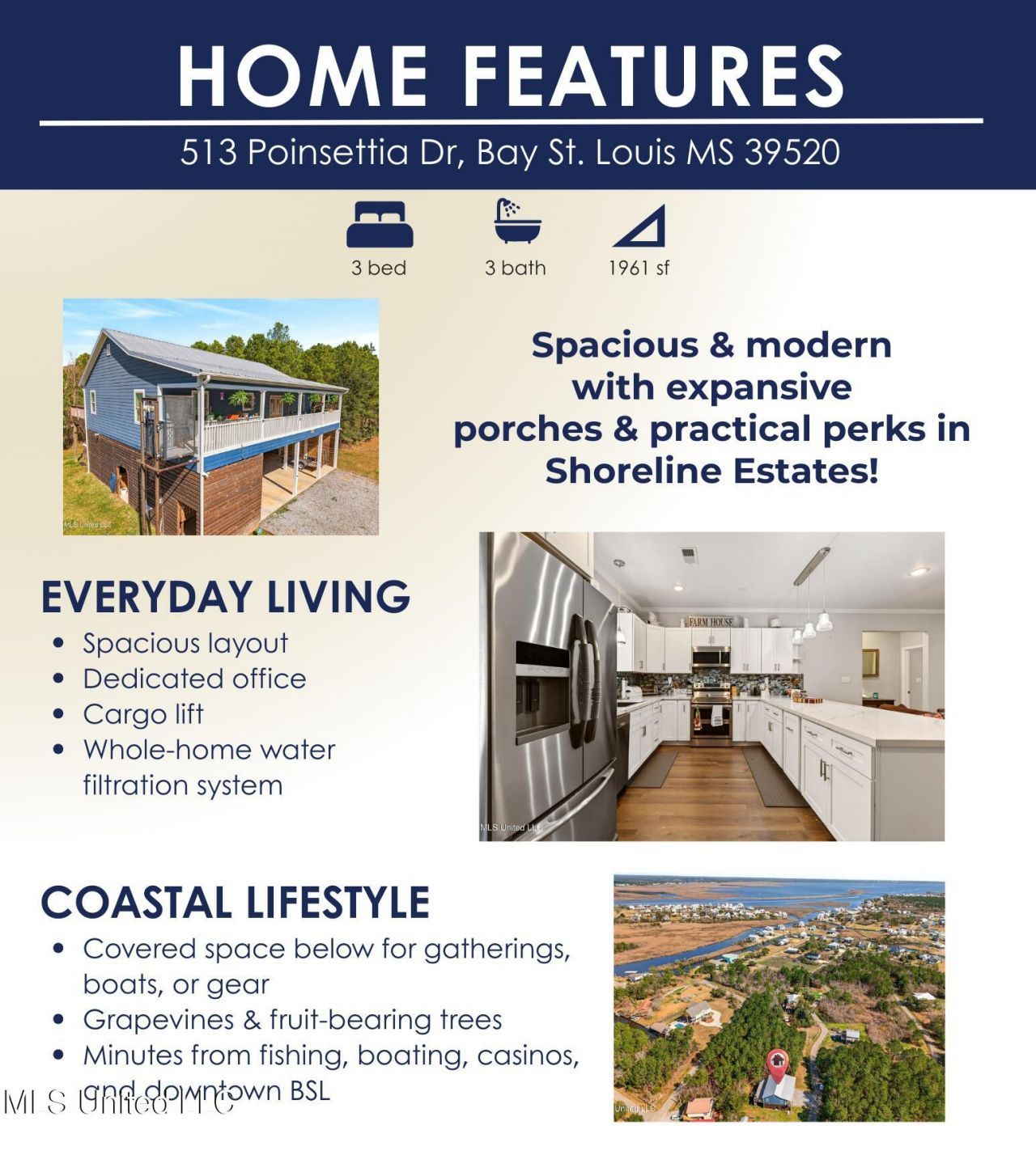 Built just a few years ago, this Shoreline Estates home is designed for true coastal living. Three bedrooms, three baths, and a dedicated office offer plenty of room to spread out. Front and back porches invite slow mornings and breezy sunsets, while the covered space below is ideal for gatherings, boats, and all the gear that comes with life near the water. The exterior cargo lift and whole-home water filtration system add comfort and practicality. Outdoors, you'll find pear, guava, and lemon trees, grapevines, and a storage shed with well water access. Minutes from fishing, boating, casinos, and the heart of Bay St. Louis, this is the kind of place that works just as well for weekends as it does for full-time living. Make it yours today!