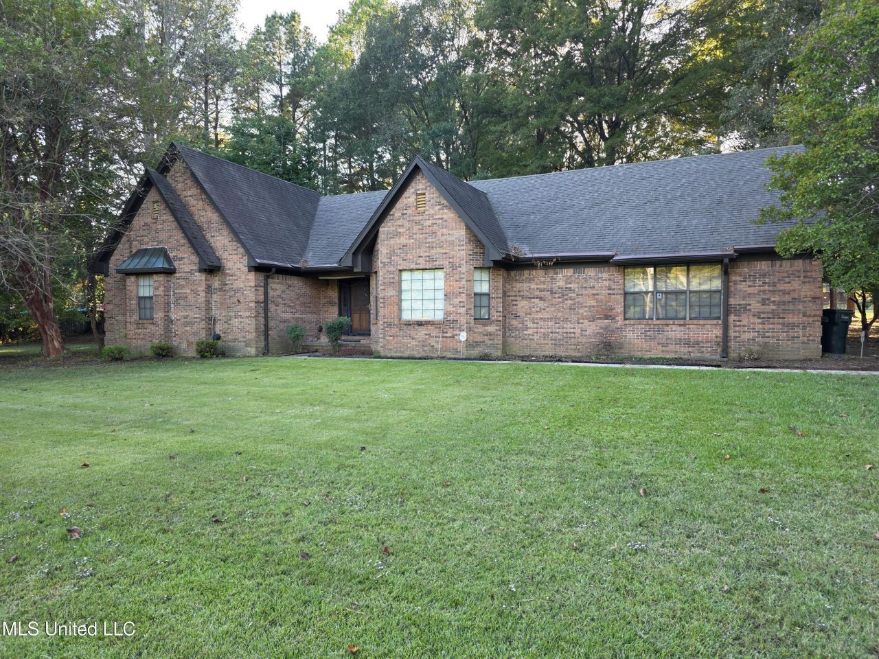 Stately residence in coveted Summerwood subdivision, nestled between Olive Branch and Southaven. Expansive, level 1.5 acre lot--mostly open in front but wooded in back. Tray ceilings in great room and primary bedroom; vaulted primary bathroom ceiling feels huge with brand new skylight. Three large bedrooms on east side of home but separated/split with a privacy wall isolating the primary bedroom suite. Spacious primary bedroom easily accommodates a king size bedroom suite. Airy and open with a screened in patio on the back to deter pests on summer nights. Brand new ceiling fans and lights throughout and brand new chair height toilets. What would have been a fourth bedroom on the west side of the home just off the kitchen was actually built as a split off locked storage room on the back of the house, a large accommodating laundry room featuring two sizeable pantries and a half bath. Pull down attic stairs in the garage. Kitchen features working retro appliances--refrigerator, cooktop, wall oven--with an over-the-cooktop microwave and a brand new garbage disposal. Olive Branch street address with Southaven utilities. While it feels quite private and boasts a security system, this wonderful charmer is mere minutes from Stateline Road, Getwell Road, Malone Road and Goodman Road! Ready now for new faces!